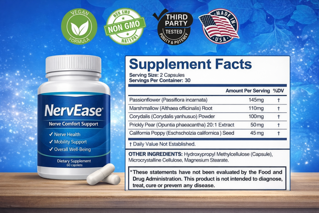 NervEase is a natural formula designed to support nerve comfort, mobility, and overall well-being.